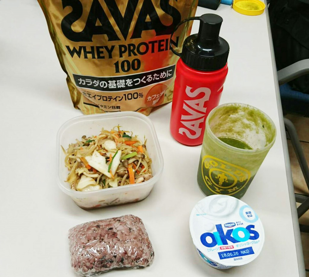 ・〔昼・間食〕黒米、野菜炒め、グリーンスムージ、おやつタイムにプロテインとオイコス